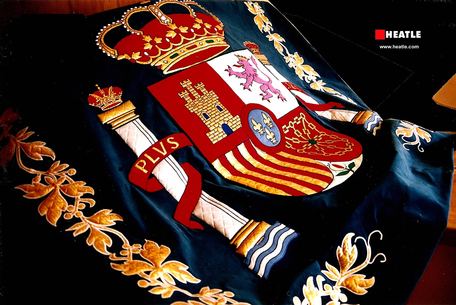 Acompañado de dos columnas de plata, con la base y capitel de oro, sobre ondas de azur o azul y plata, superada la corona imperial la diestra, y de una corona real la siniestra, ambas de oro, y rodeando las columnas una cinta de gules o rojo, cargada de letras de oro, en la diestra "Plus" y en la siniestra "Ultra", (del latín Plus Ultra, Más Allá).
